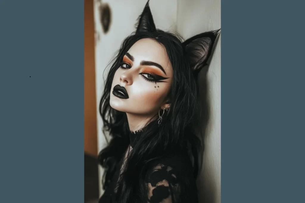 Essa maquiagem aposta no visual dark com um toque sensual. O delineado preto bem marcado cria um olhar felino intenso, enquanto a pele clara e o batom preto reforçam o estilo gótico clássico.