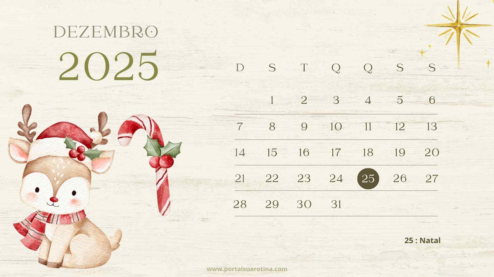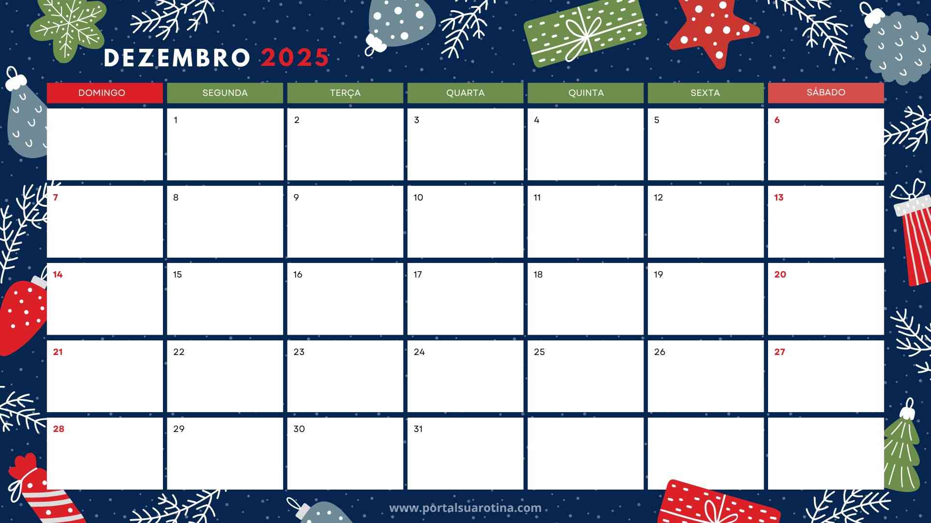 Confira abaixo modelos de calendário de dezembro 2025 prontos para baixar e imprimir em casa.