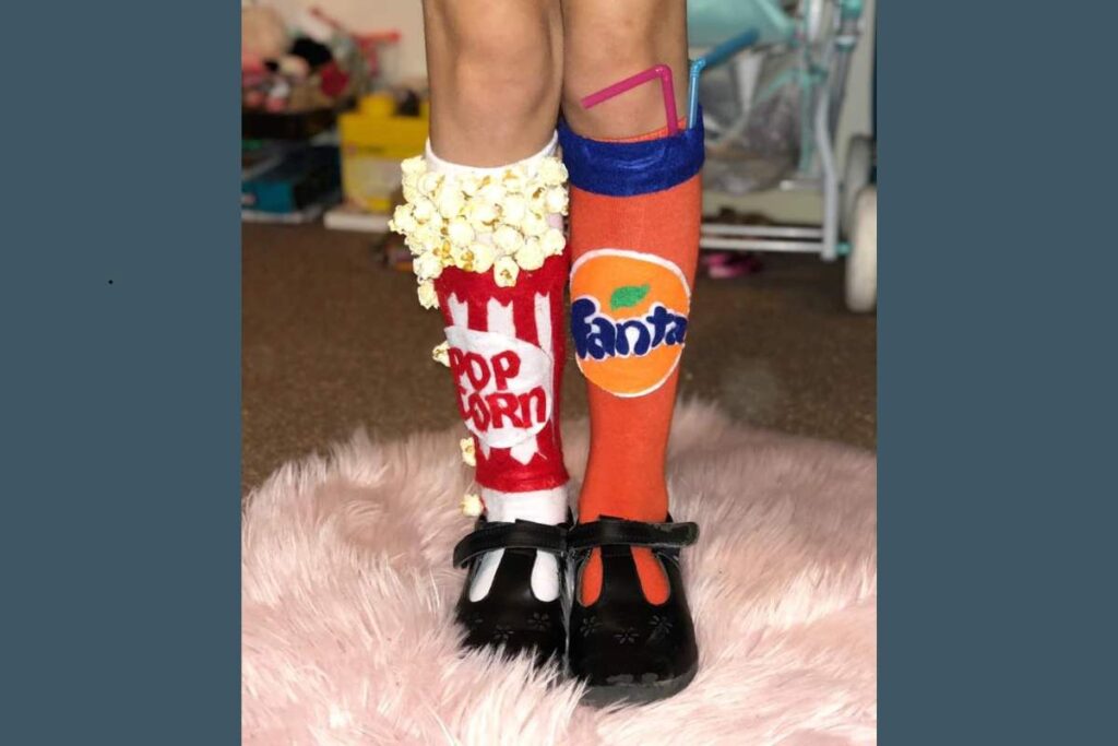Essa meia maluca infantil aposta no humor e na criatividade ao unir dois clássicos: pipoca e Fanta. O visual divertido, com referências a lanches, chama atenção e deixa o look descontraído e original.