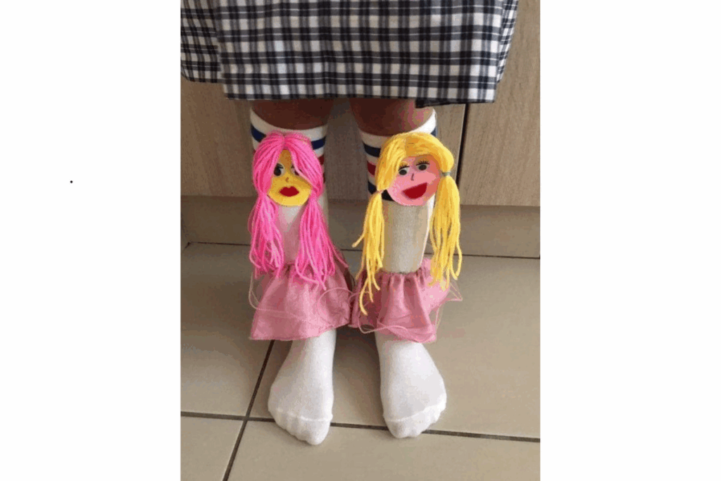Esse modelo traz meias decoradas com rostinhos feitos em feltro e cabelos de lã colorida. É divertido, original e chama atenção no ambiente escolar.