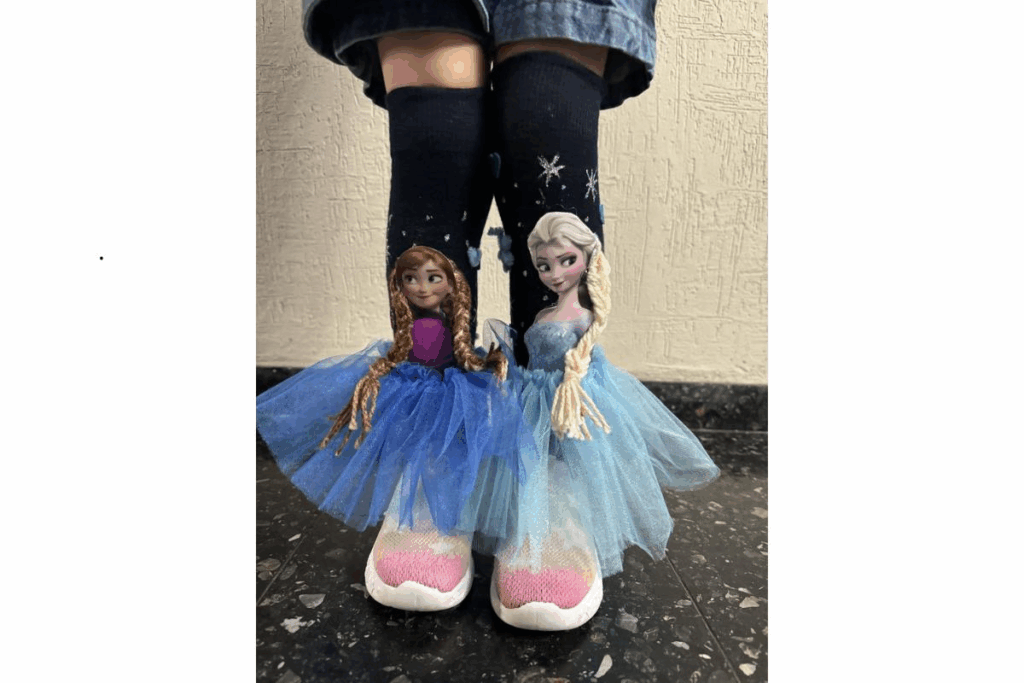 Inspirada nas princesas Anna e Elsa, essa meia maluca feminina combina bonecas aplicadas com saias de tule. Além de ser criativa, conecta-se ao universo infantil, garantindo destaque em dias temáticos na escola.