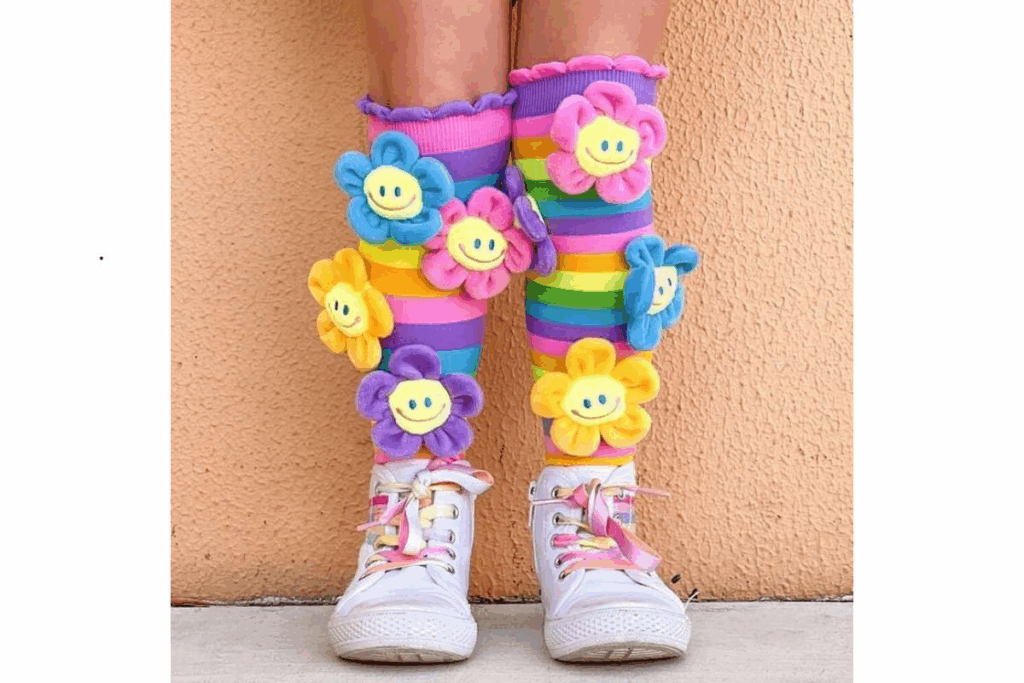 Aqui, as meias ganham vida com flores coloridas de pelúcia aplicadas sobre listras em arco-íris. O resultado é vibrante, alegre e perfeito para iluminar qualquer evento.