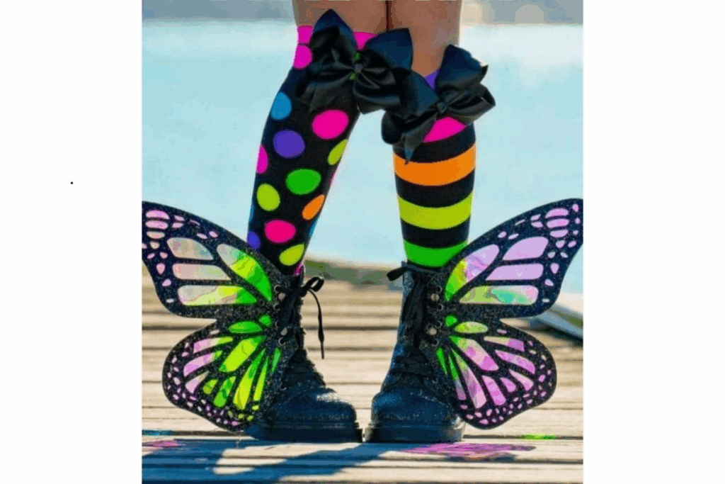 Esse modelo traz asas grandes aplicadas ao calçado, em combinação com meias estampadas de bolinhas e listras coloridas. O resultado é um visual ousado e encantador, que chama atenção pela mistura de cores e formas.