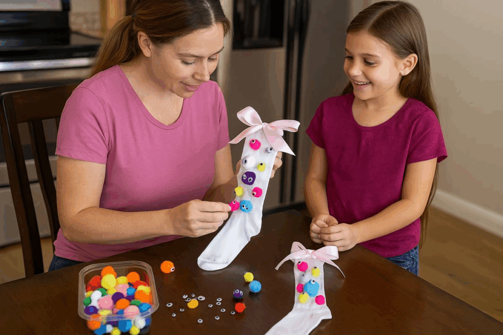 A ideia de transformar as meias em pequenas bonecas torna o visual lúdico e encantador.