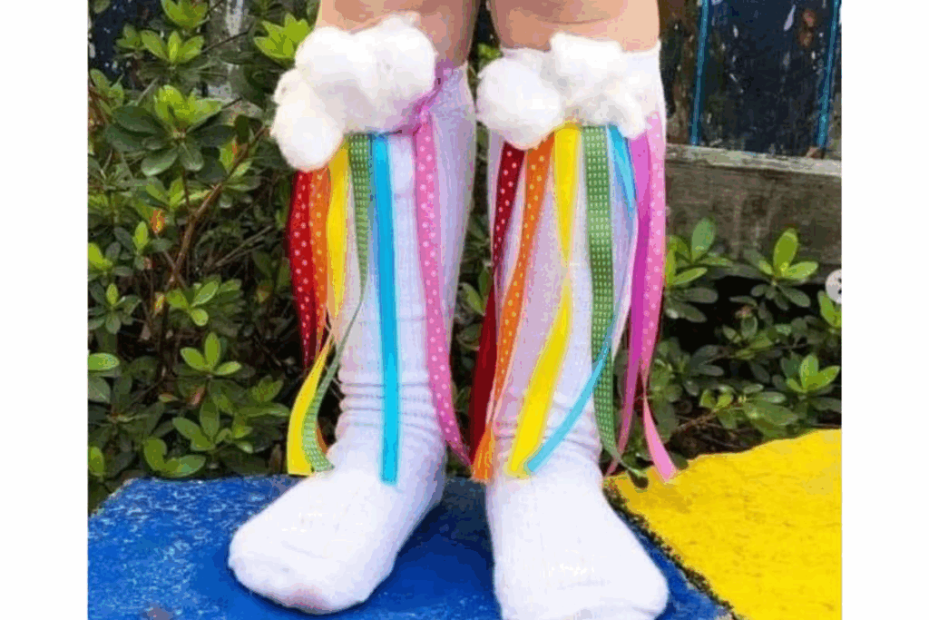 Esse modelo aposta em fitas coloridas aplicadas em meias brancas, finalizadas com nuvens de algodão no topo. A inspiração no arco-íris deixa o look divertido e cheio de fantasia.