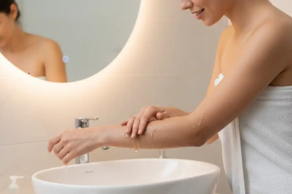Depois disso, tome banho normalmente. Um sabonete hidratante ajuda na limpeza final, e uma esponja suave pode ser usada com cuidado, se necessário.