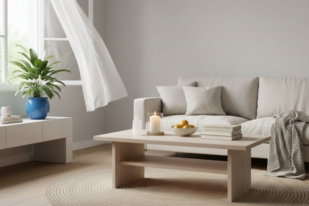 Abrir portas e janelas é o primeiro passo. A circulação de ar elimina a sensação de ambiente pesado e traz vitalidade. Mesmo alguns minutos por dia são suficientes para melhorar a energia do espaço.