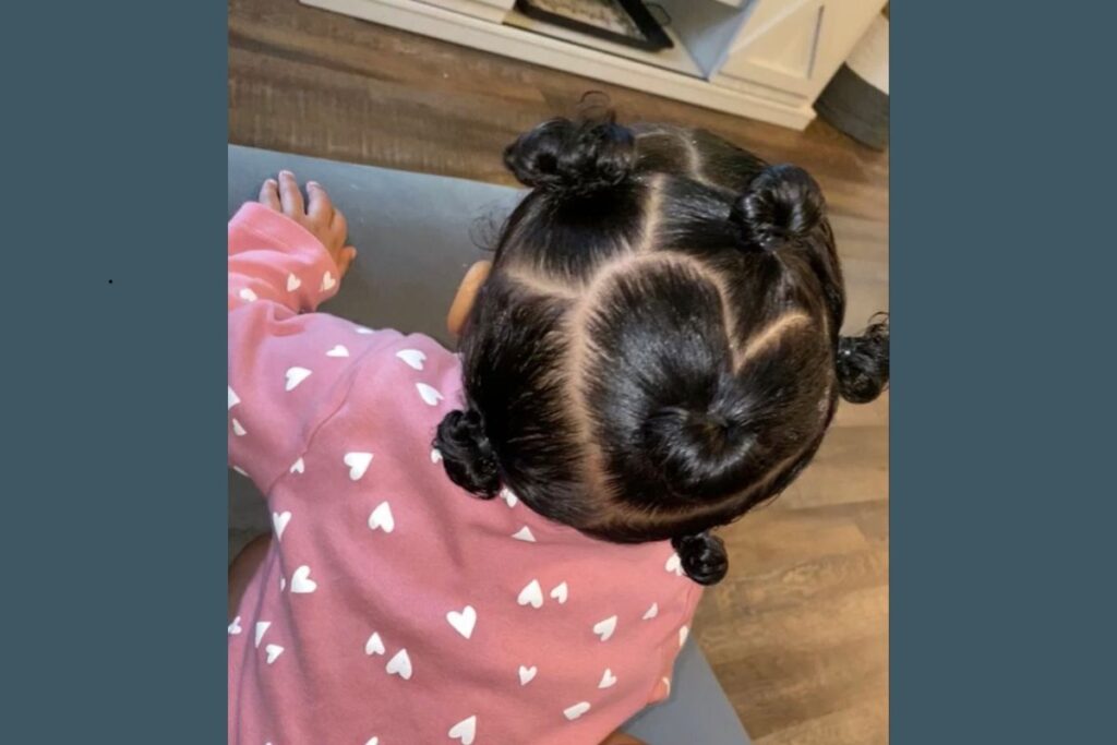 Um penteado cheio de amor e criatividade! As mechas são separadas de forma que o couro cabeludo forme um desenho de coração, e os coquinhos são finalizados com cuidado para destacar o formato.