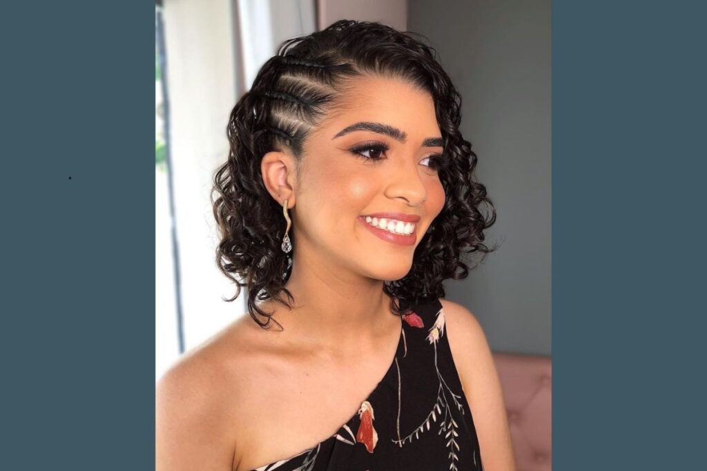Esse penteado valoriza a textura natural dos cachos e traz sofisticação com as laterais bem definidas. É uma ótima escolha para quem quer um visual moderno sem abrir mão do volume. Funciona bem em festas noturnas e combina com maquiagem iluminada.