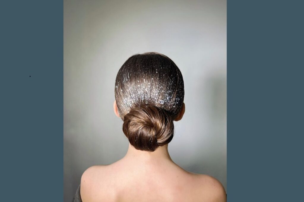 Clássico e elegante, o coque baixo é uma escolha segura para a virada. O acabamento alinhado traz sofisticação imediata e funciona muito bem com vestidos mais elaborados. Pequenos pontos de brilho dão um toque festivo sem exagero.