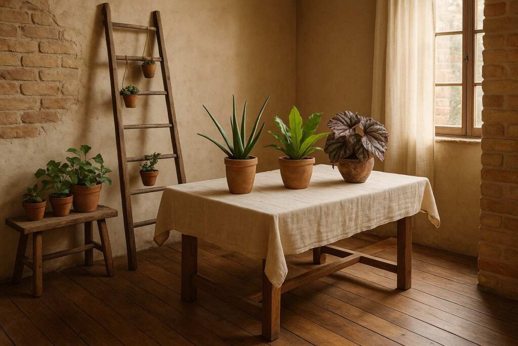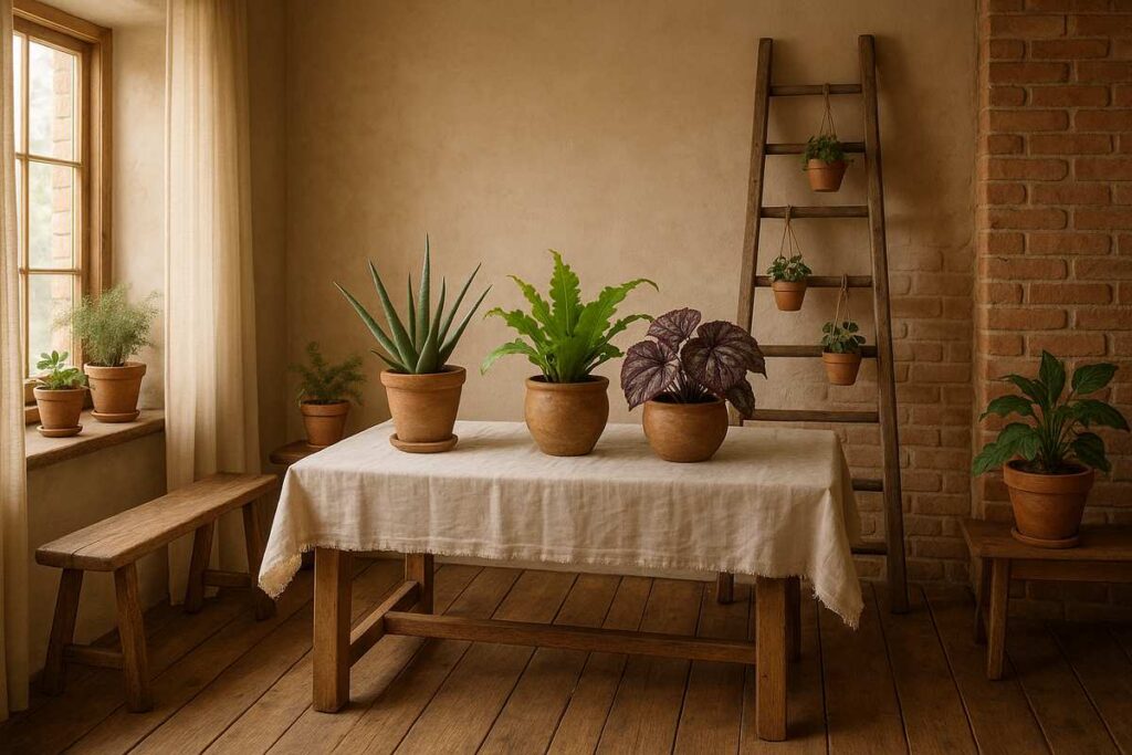 Dica prática: Use uma escada de madeira encostada na parede como suporte vertical para pequenos vasos. Além de funcional, vira um ponto focal do ambiente.