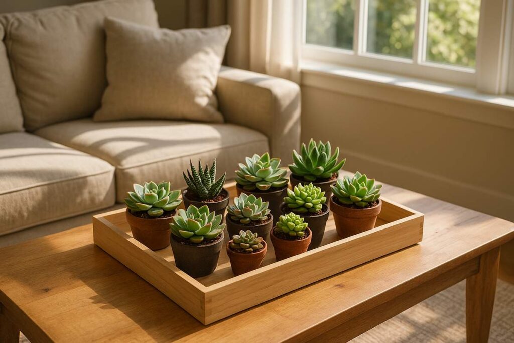 Dica prática: Crie um “mini jardim” sobre o aparador da sala com plantas em vasos neutros, intercalados com objetos de cerâmica clara. Isso gera conforto visual e harmonia.