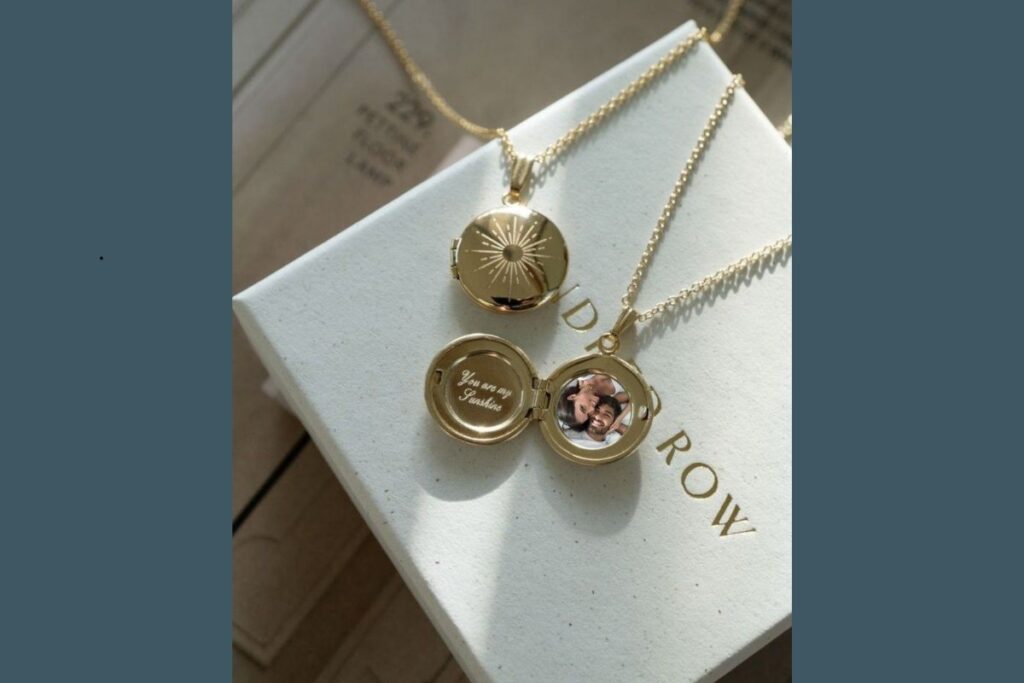 O colar dourado com relicário é uma opção clássica e sentimental. Dentro dele, é possível incluir uma pequena foto de alguém especial e uma frase gravada, como “You are my sunshine”.