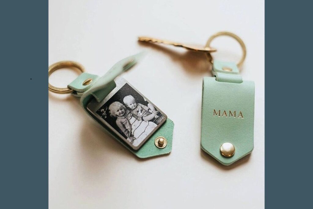 O modelo em couro verde com a palavra “MAMA” gravada em dourado, por exemplo, combina elegância com emoção. Ao abrir, revela uma foto significativa, um toque afetivo que torna o objeto único.