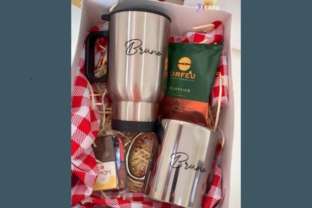 Uma caixa com caneca térmica gravada com o nome da pessoa, acompanhada de chocolates e café especial, cria um presente completo e elegante. Além de útil, transmite aconchego e cuidado.