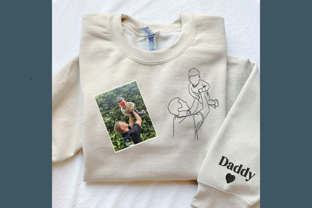 As roupas personalizadas com desenhos minimalistas estão em alta. Essa ideia mistura arte e sentimento: a blusa exibe um traço ilustrando um momento marcante, ao lado da foto real.