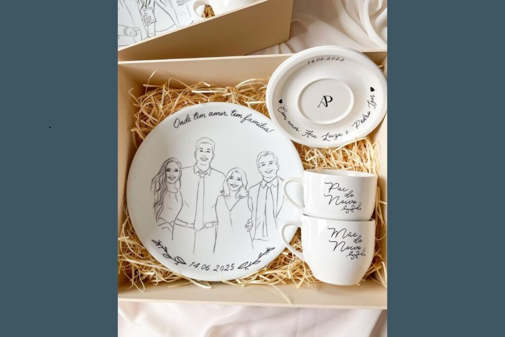 Imagine uma porcelana com o retrato da família, data especial e frases como “Onde tem amor, tem família”. Esse tipo de lembrança une utilidade, beleza e emoção, sendo ideal para presentear pais, avós ou casais.