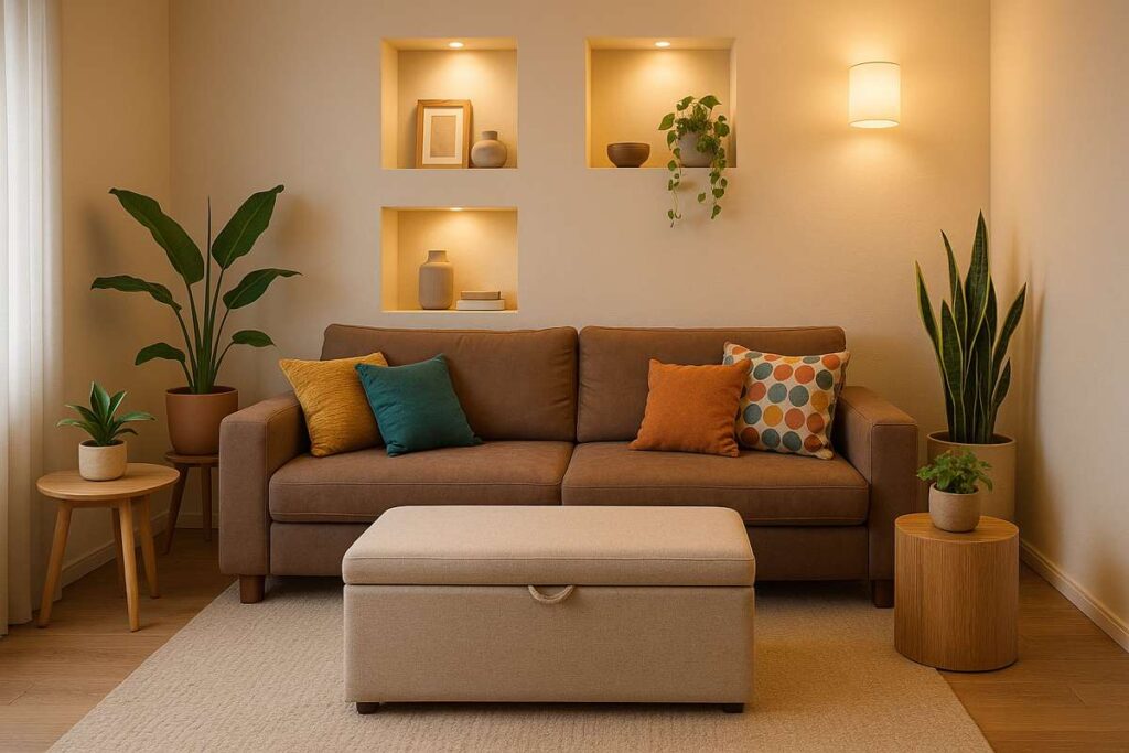 - Sala pequena: escolha puffs menores e multifuncionais, como os redondos ou baús.