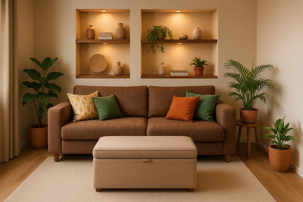 - Como mesa de centro: centralize o puff no meio da sala e use uma bandeja decorativa para apoio.