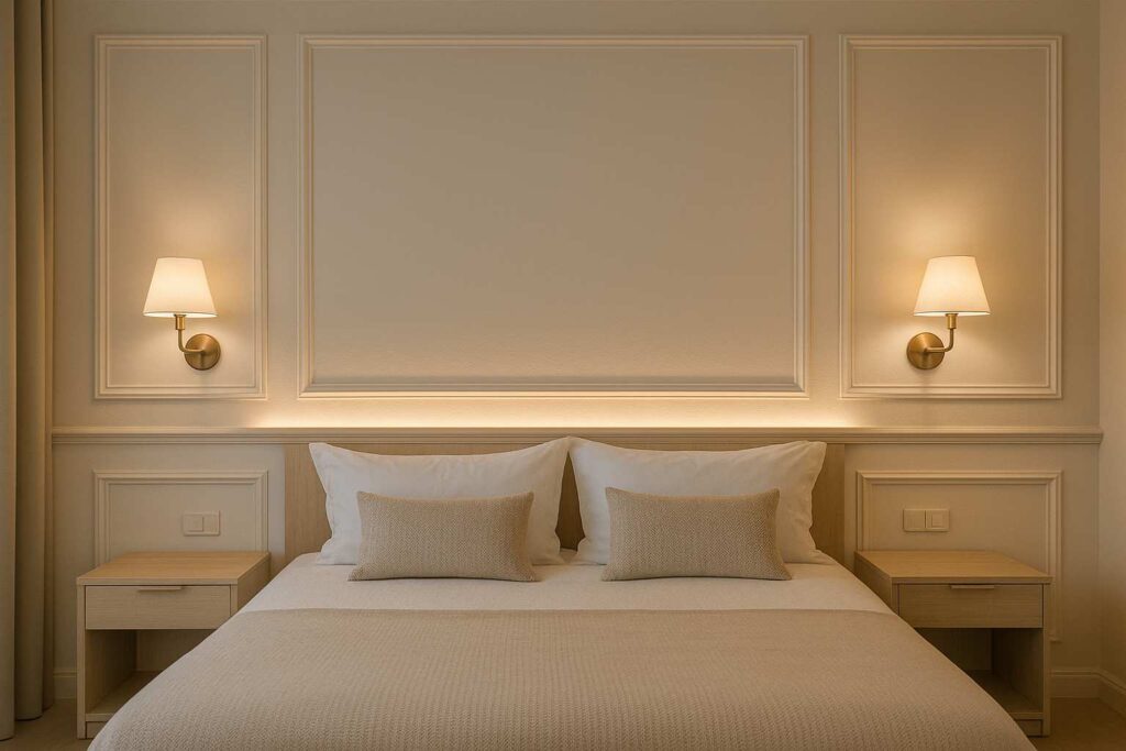 Combinar boiserie com fitas de LED ou arandelas embutidas cria um efeito dramático e funcional. A luz ressalta o relevo das molduras e proporciona iluminação indireta aconchegante para o quarto.