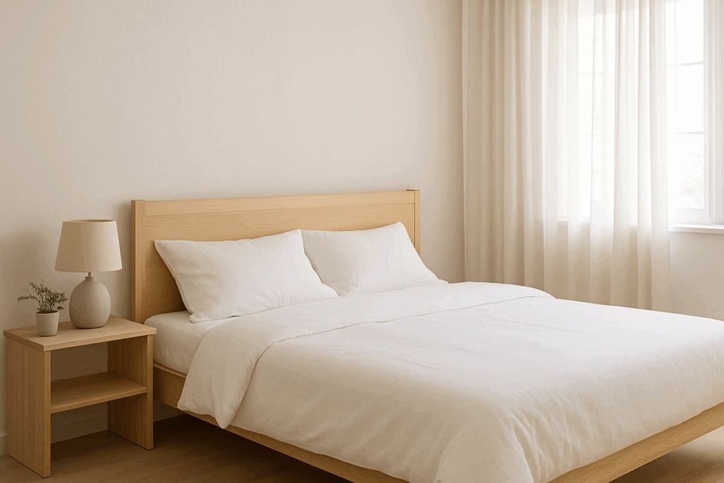 Prefira camas de linhas retas, em madeira clara ou acabamento branco. A cabeceira pode ser simples ou estofada, sempre em tecidos neutros.