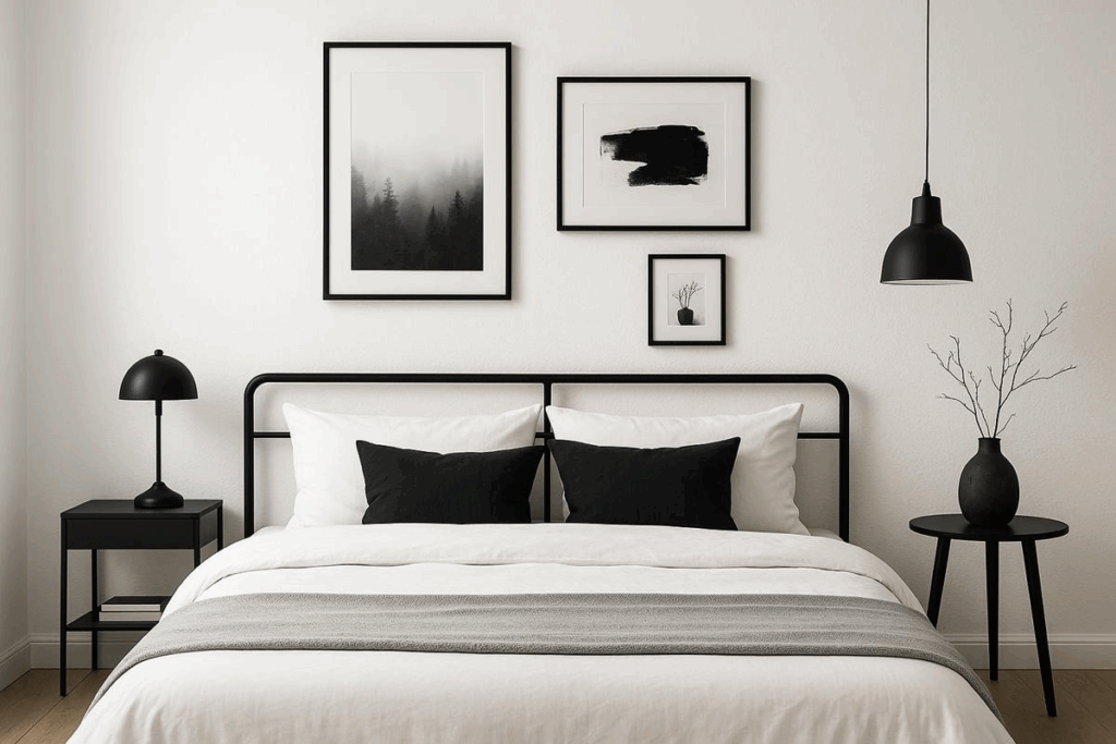 O preto pode ser usado em detalhes, como molduras de quadros ou luminárias, criando equilíbrio visual sem pesar na composição.