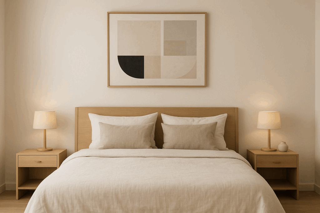 Para evitar a monotonia, um quadro geométrico em tons neutros decora a parede principal, trazendo personalidade de forma sutil.