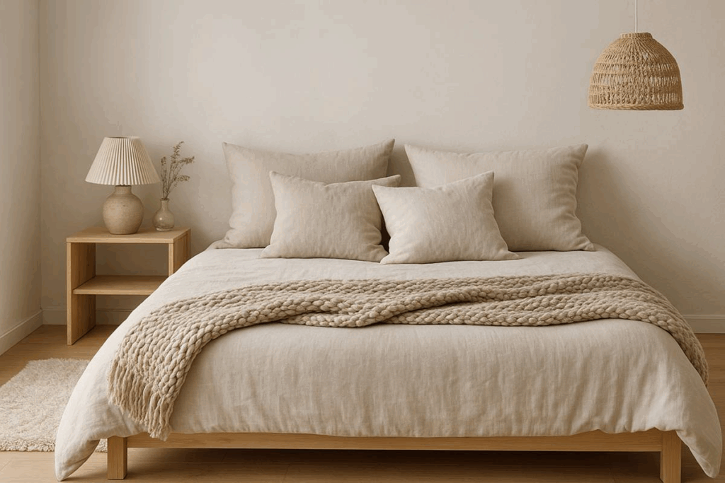 Camadas leves de mantas ou colchas em cores neutras ajudam a criar profundidade e sensação de conforto, sem sobrecarregar o quarto.