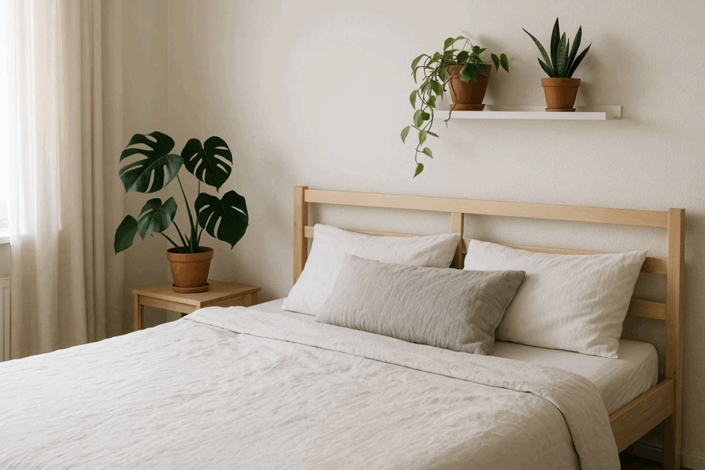 Vasos simples com folhagens verdes posicionados ao lado da cama ou em prateleiras discretas adicionam cor e naturalidade ao ambiente.