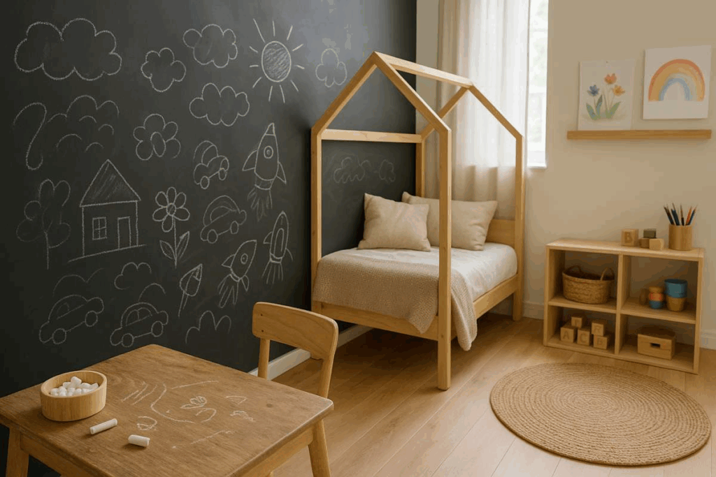 Uma parede pintada com tinta de lousa permite que a criança desenhe à vontade, estimulando a imaginação.