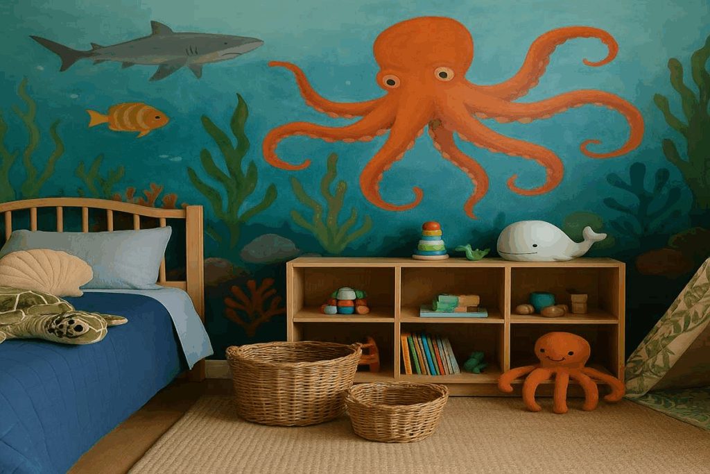 Transforme o ambiente em um cenário de aventura, como fundo do mar ou floresta, com decoração temática e espaço reservado para os brinquedos.