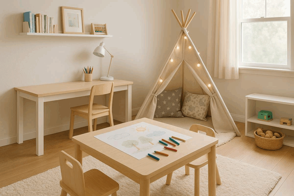 Coloque uma mesa multifuncional que sirva para desenhar, pintar e depois ser usada para os deveres escolares.