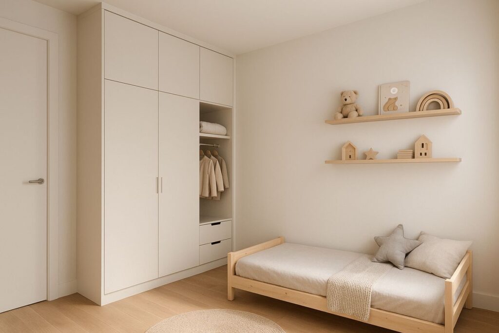 No quarto minimalista, um dos princípios é incentivar a autonomia da criança. Para isso, é importante que os móveis estejam na altura dos pequenos. Cabideiros baixos, ganchos de parede e pequenos aparadores ajudam a criança a pendurar suas roupas, mochilas ou acessórios sem precisar de ajuda constante.