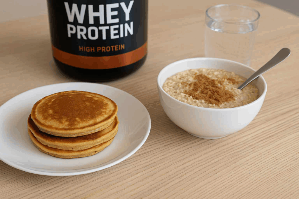 A panqueca proteica é uma das receitas mais práticas com whey protein, perfeita para o café da manhã ou lanche da tarde.