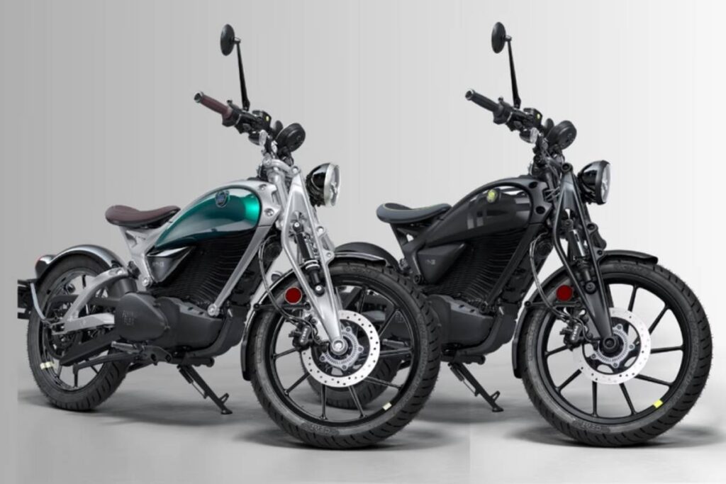 A moto será oferecida em duas opções de cores: Flea Green, com chassi prata e detalhes em marrom, e Storm Black, com acabamento totalmente escurecido.