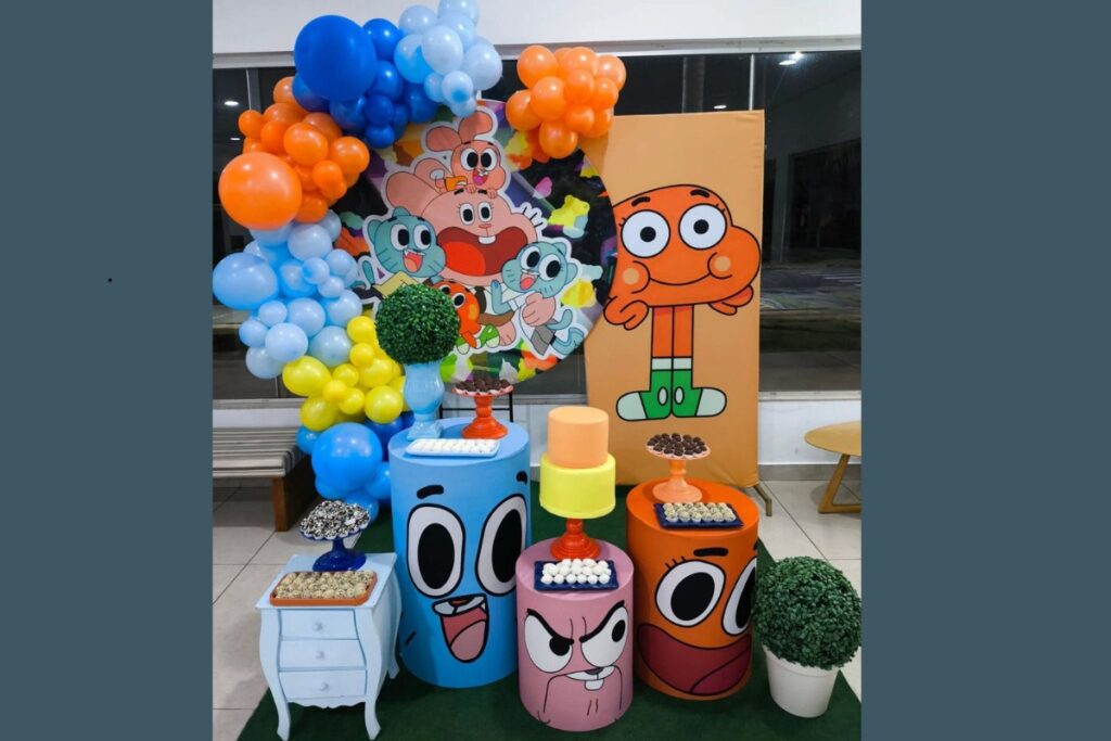 A decoração costuma usar painéis grandes com os protagonistas, mesas cilíndricas personalizadas e arcos de balões em tons de azul, verde e laranja.