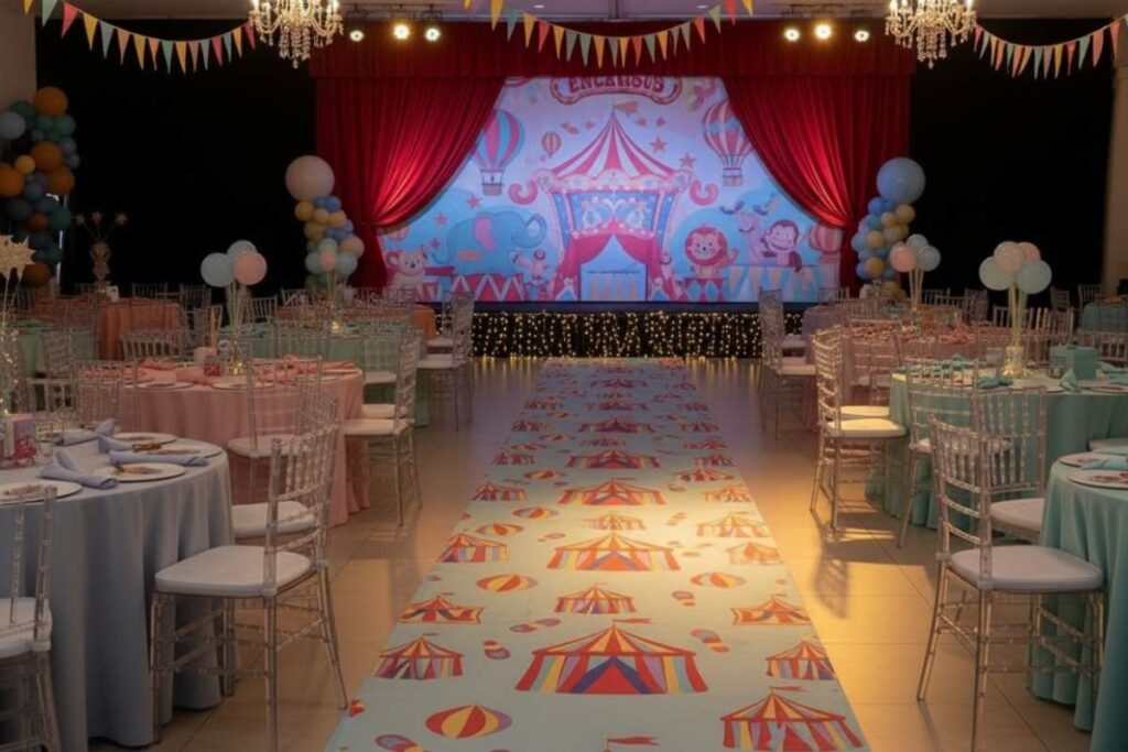 O tema circo oferece um clima festivo e cheio de cor. Ele cria uma atmosfera lúdica que encanta os pequenos e deixa o evento divertido.