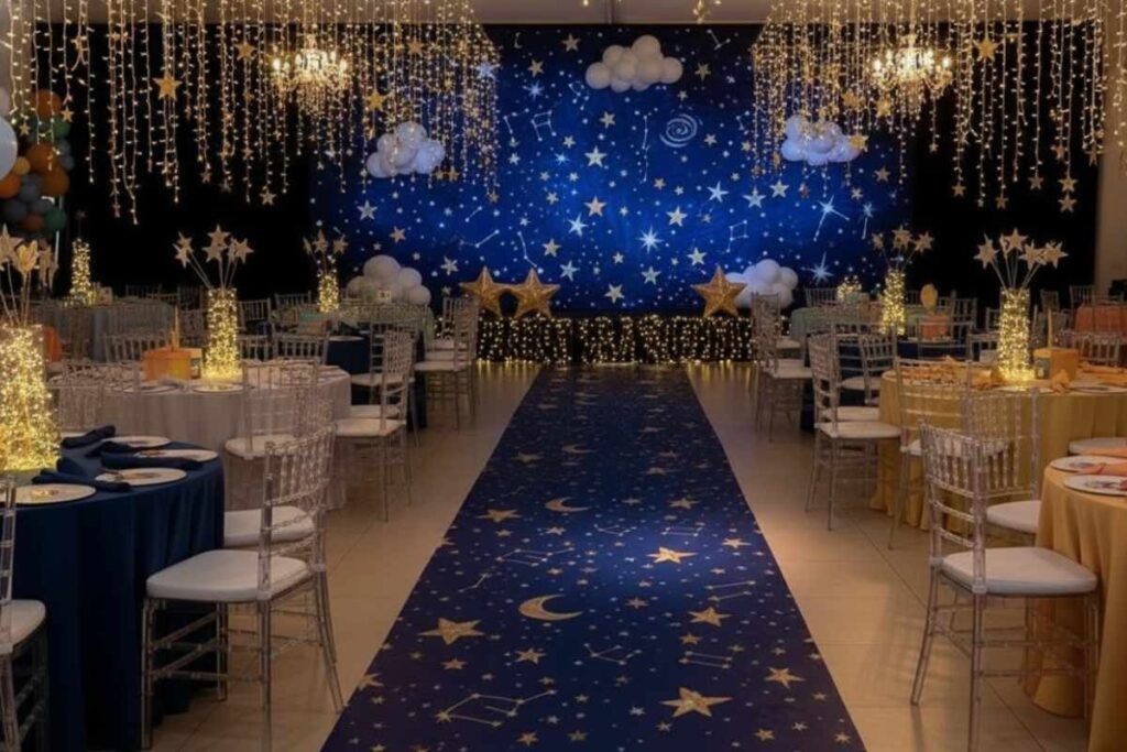 Estrelas representam conquistas, metas e luz, ideias perfeitas para crianças prestes a iniciar uma nova fase. A decoração pode incluir chuva de estrelas, luzes amarelas, painéis escuros e projeções.