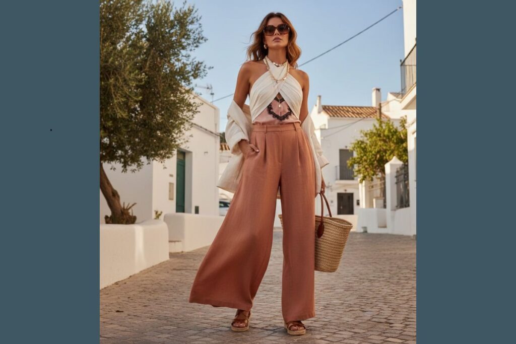 Outra tendência forte de 2026 é o visual inspirado em roupas de dormir. Tops acetinados, alcinhas de cetim com renda e blusinhas de brilho suave aparecem combinados a alfaiataria, jeans estruturado e peças retas.