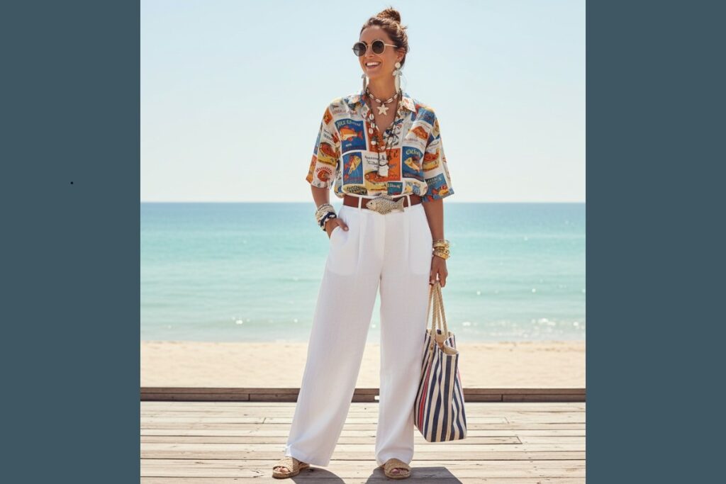 Vestidos, saias, camisas e conjuntos coordenados recebem estampas de peixe em versões que lembram rótulos antigos, plaquinhas de praia e cartazes dos anos 60. O efeito é divertido e transforma até produções básicas em looks cheios de presença.