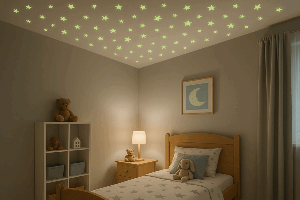 Quarto infantil com teto decorado por adesivos de estrelas fluorescentes