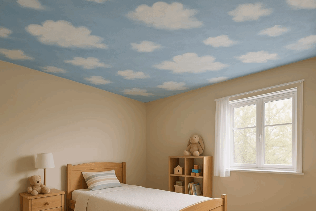 Quarto infantil com teto azul e nuvens, criando efeito de céu calmo
