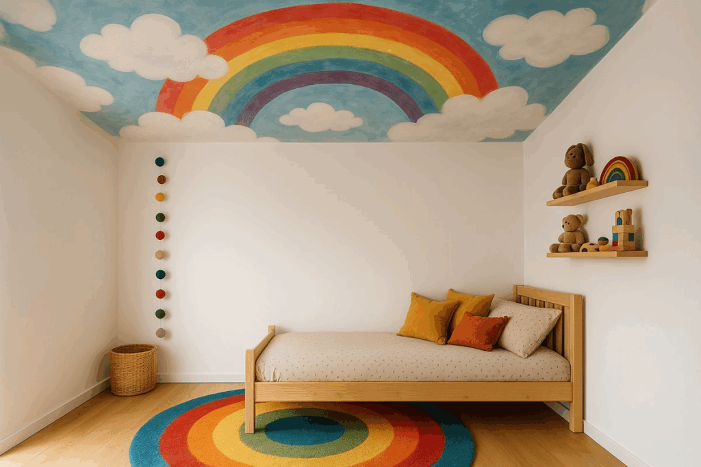 Quarto infantil com teto pintado à mão e decoração colorida