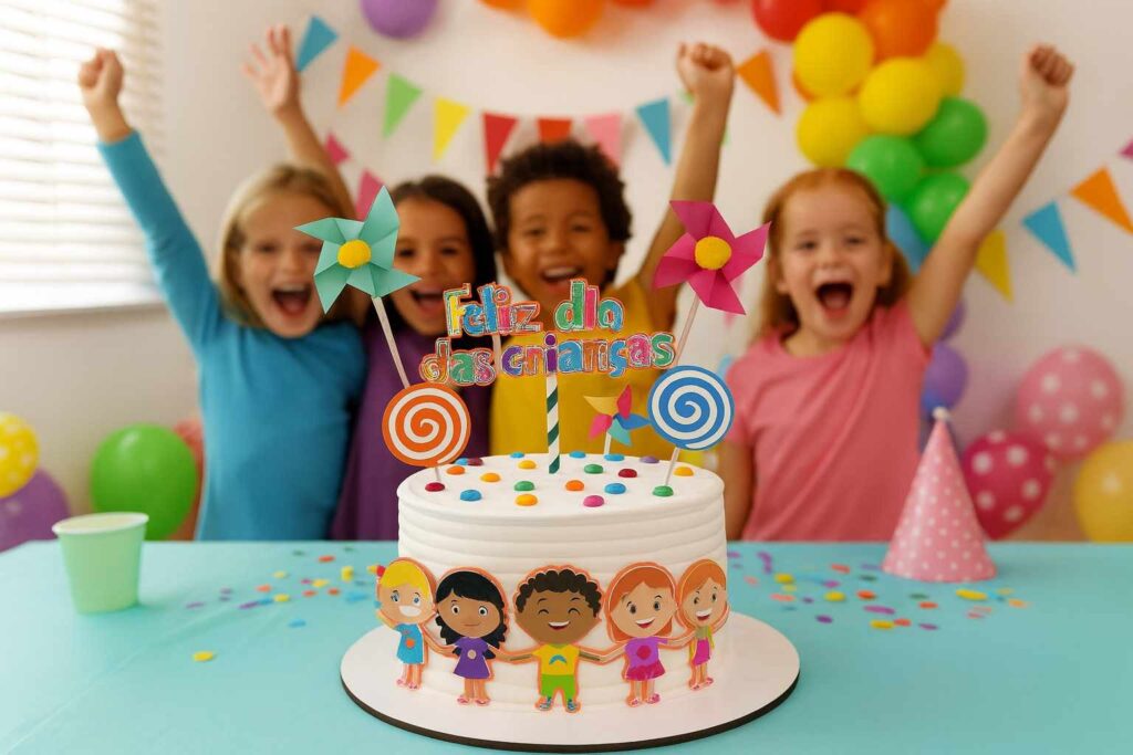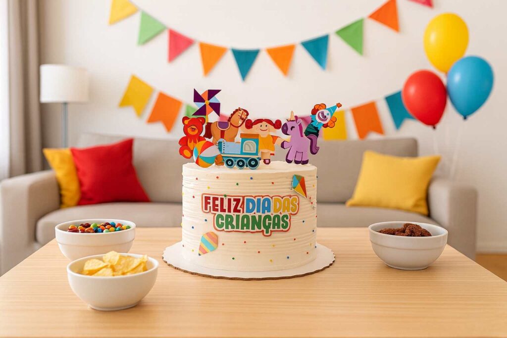 O topo de bolo Feliz Dia das Crianças também é ideal para eventos em escolas e creches. Professores podem preparar bolos coletivos com decorações simples, mas encantadoras.