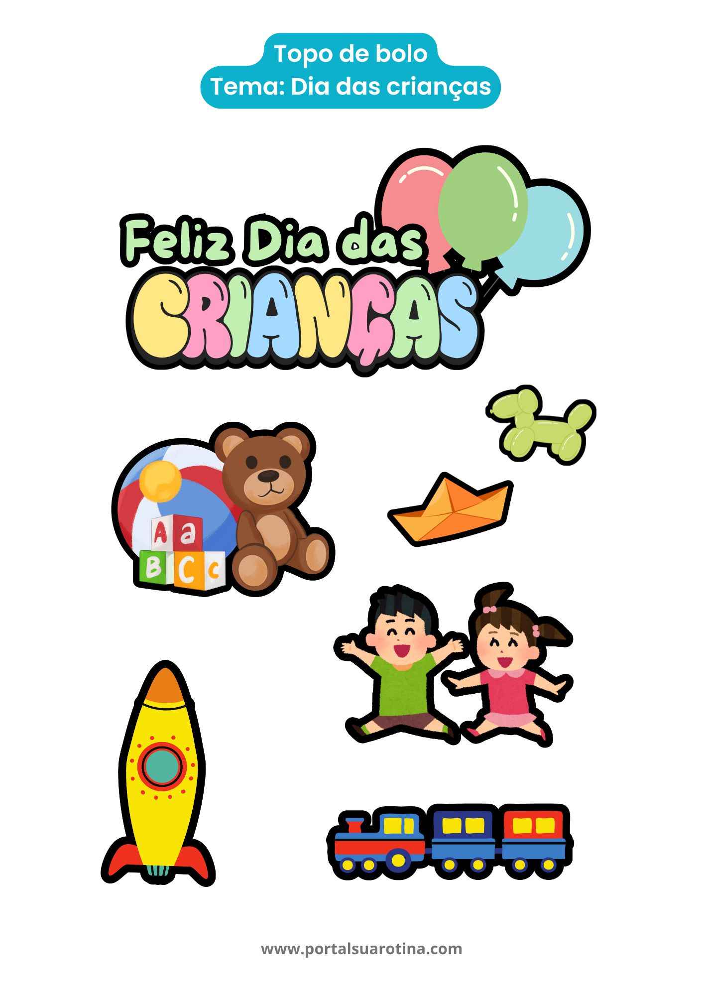 Você pode optar por um topo de bolo para imprimir com frases, personagens ou desenhos coloridos. Existem versões clássicas com o texto “Feliz Dia das Crianças” e outras com temas variados, como balões, nuvens, arco-íris e brinquedos.