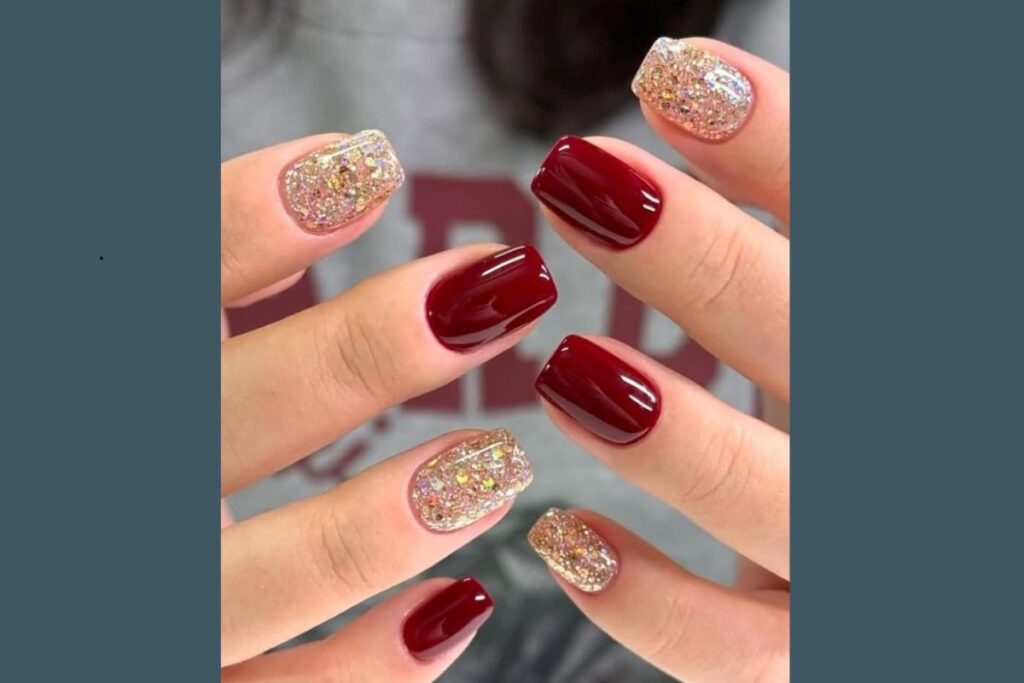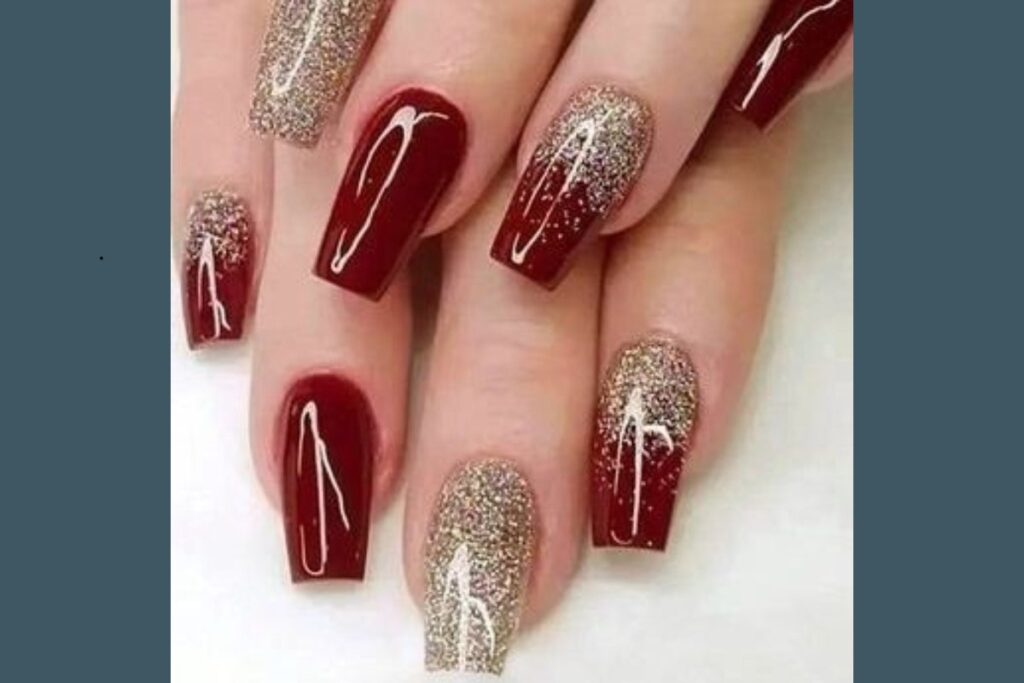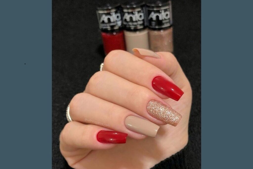 Esta proposta mistura o clássico vermelho com o nude e o glitter dourado, equilibrando elegância e sofisticação.