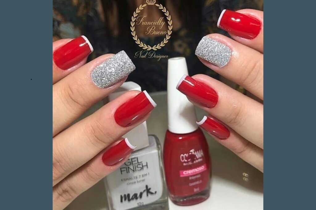 2. Unhas vermelhas com francesinha branca e glitter prateado