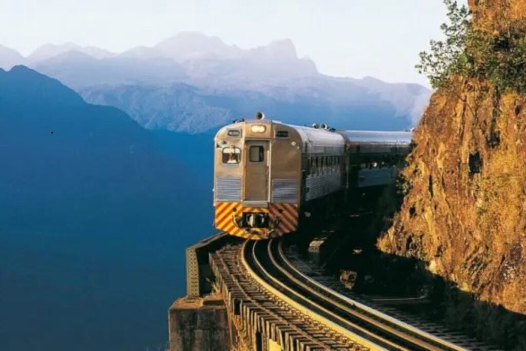 O trem avança por túneis escavados na década de 1880, cruza pontes de ferro e contorna montanhas íngremes com uma vista que parece não ter fim.
